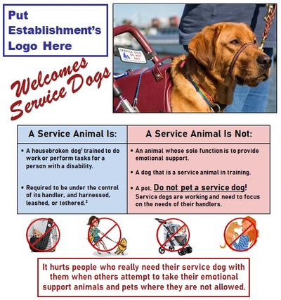 Stores, community centers, restaurants, and other public facilities are having a difficult time with people wanting to bring their pets into these public spaces, and claiming they are service animals. This poster is designed to educate your customers, staff, and the public at large about what qualifies as a service doge pursuant to the Americans with Disabilities Act (ADA). You can download this poster (Microsoft Word file below), and edit as you see fit.
