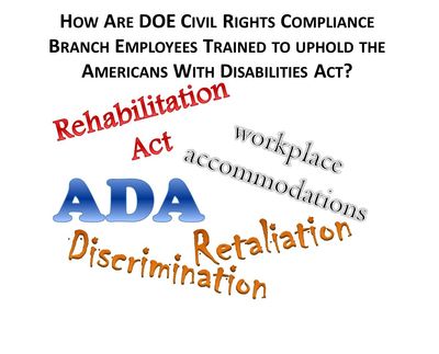 I request copies of any and all publications, training materials, procedures or memos that teach, train, and/or guide DOE Civil Rights Compliance Branch employees how to abide by the ADA and Rehabilitation Act federal laws with regard to workplace accommodations, claims of employee discrimination and employee retaliation. For each record, please specify the archived location of the record within DOE (e.g. URL).