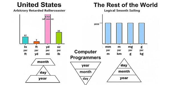 The US.A. is so regressive, it still hasn't converted to the metric system. If the U.S.A. wants to be a great country its citizens will stop being tunnel-visioned xeno-idiots, and recognize that to be a leader, the first step is to get in sync with the rhythm of the world.